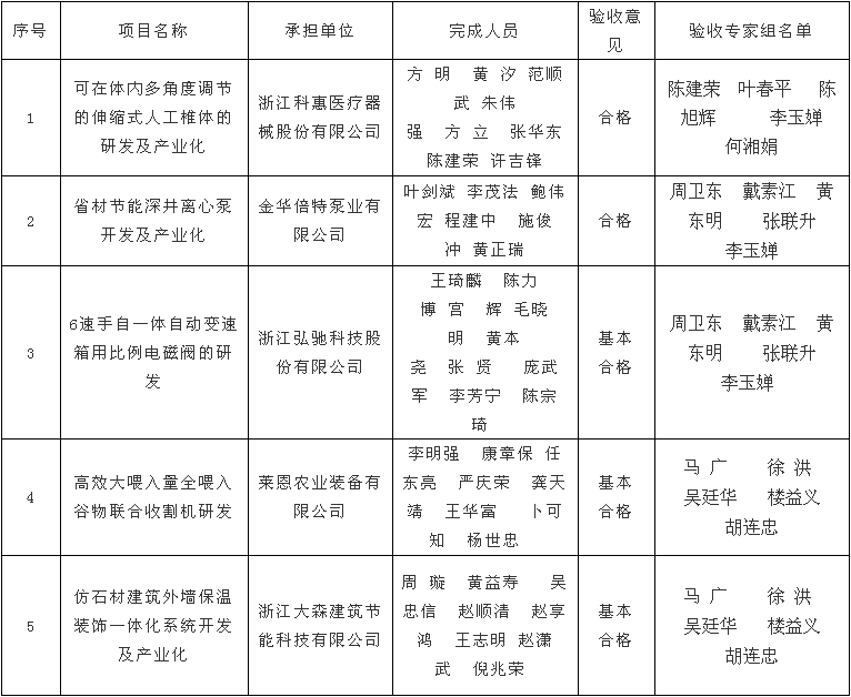 根據(jù)《金華市級(jí)科技計(jì)劃項(xiàng)目驗(yàn)收管理辦法》(金市科字〔2015〕83號(hào))規(guī)定,現(xiàn)將浙江科惠醫(yī)療器械股份有限公司、金華倍特泵業(yè)有限公司、浙江弘馳科技股份有限公司、萊恩農(nóng)業(yè)裝備有限公司、浙江大森建筑節(jié)能科技有限公司承擔(dān)的《可在體內(nèi)多角度調(diào)節(jié)的伸縮式人工椎體的研發(fā)及產(chǎn)業(yè)化》、《省材節(jié)能深井離心泵開發(fā)及產(chǎn)業(yè)化》、《6速手自一體自動(dòng)變速箱用比例電磁閥的研發(fā)》、《高效大喂入量全喂入谷物聯(lián)合收割機(jī)研發(fā)》、《仿石材建筑外墻保溫裝飾一體化系統(tǒng)開發(fā)及產(chǎn)業(yè)化》5個(gè)市級(jí)科技計(jì)劃項(xiàng)目驗(yàn)收結(jié)果予以公示,接受社會(huì)監(jiān)督,公示期從2017年9月26日至10月8日止。任何單位和個(gè)人對(duì)驗(yàn)收意見持有異議的,應(yīng)當(dāng)在公示期內(nèi)書面向市科技局提出異議,單位應(yīng)采用書面形式并加蓋公章,個(gè)人應(yīng)采用實(shí)名提出異議。