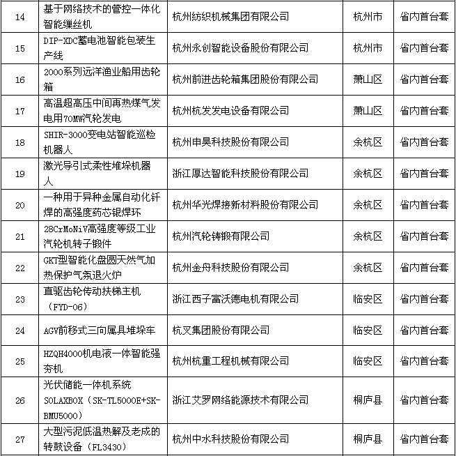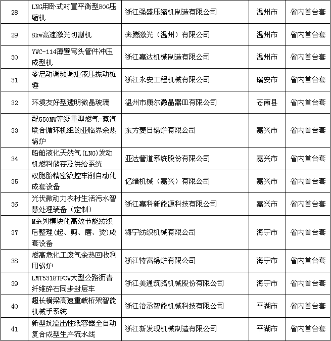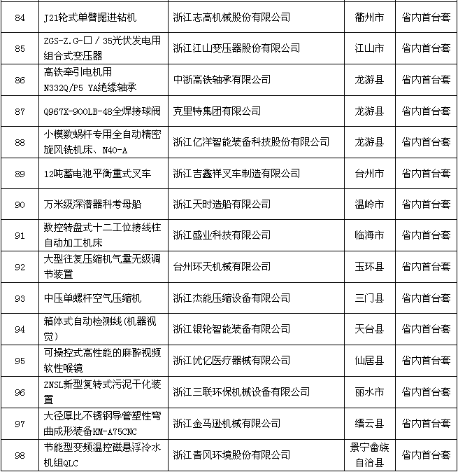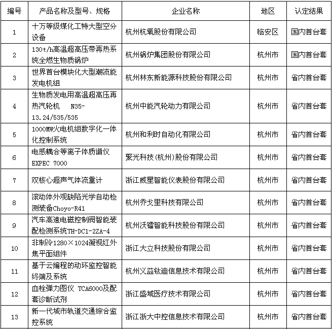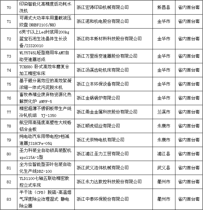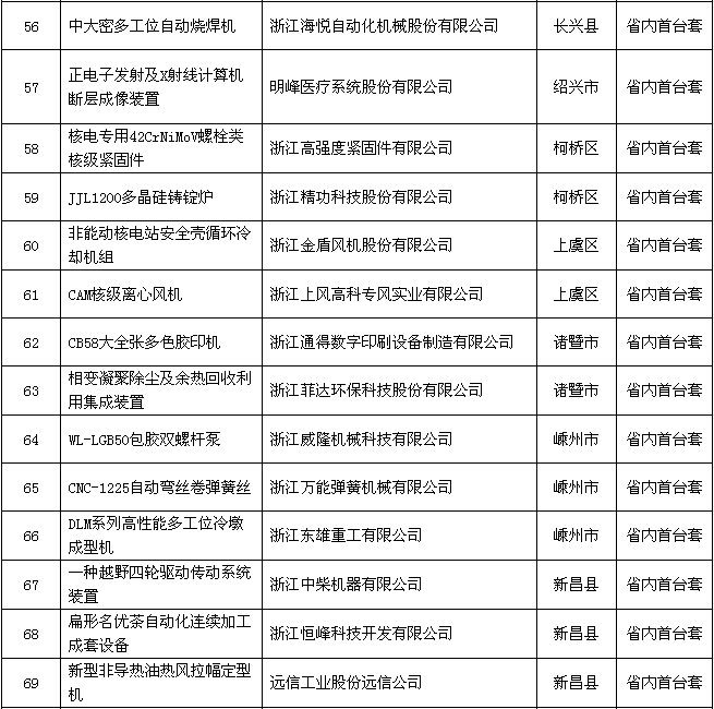 2018年度浙江省裝備制造業(yè)重點(diǎn)領(lǐng)域首臺(tái)(套)產(chǎn)品認(rèn)定結(jié)果公示名單