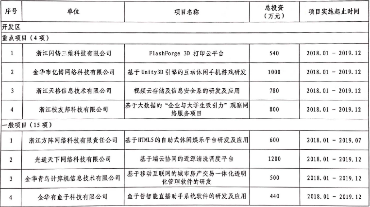 件和信息服務(wù)產(chǎn)業(yè)基地能力提升工作的通知)) (浙經(jīng)信軟件(2018) 53 號)、《浙江省工業(yè)和信息化發(fā)展財政專項資金使用管理暫行辦法)) (浙財企(2014) 189 號)以及《關(guān)于做好2018 年省軟件和信息服務(wù)產(chǎn)業(yè)基地能力提升專項資金項目的通知)) (金網(wǎng)經(jīng)發(fā)(2018) 13 號)文件精神,經(jīng)申報單位自主申報,金華開發(fā)區(qū)網(wǎng)絡(luò)經(jīng)濟局推薦上報,市網(wǎng)絡(luò)經(jīng)濟局根據(jù)省財政專項扶持資金支持重點方向,組織專家對區(qū)推薦上報的項目從項目實施內(nèi)容、項目技術(shù)創(chuàng)新、項目市場前景、項目經(jīng)濟和社會效益等方面進(jìn)行了綜合評審并經(jīng)公示、復(fù)核,確定浙江閃鑄三維科技有限公司"FlashForge 3D 打印云平臺"等19個項目入選2018年省軟件和信息服務(wù)產(chǎn)業(yè)基地能力提升專項資金項目計劃,其中重點項目4 個、一般項目15 個,現(xiàn)印發(fā)給你們。建議重點項目扶持資金額按高于一般項目扶持資金額30%左右安排。請你們參照《浙江省信息服務(wù)業(yè)發(fā)展專項資金項目驗收管理暫行辦法)) (浙經(jīng)信軟件(2011) 601 號)要求,及時通知各項目承擔(dān)單位簽訂項目合同書,并會同區(qū)財政部門做好資金落實、業(yè)務(wù)指導(dǎo)和監(jiān)督檢查工作。