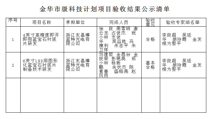 根據《金華市級科技計劃項目驗收管理辦法》(金市科字〔2015〕83號)規(guī)定,現將浙江東晶博藍特光電有限公司承擔的《4英寸高精度即開即用藍寶石襯底片研發(fā)》和《6英寸LED用圖形化藍寶石襯底片制備技術研發(fā)》2個市級科技計劃項目驗收結果予以公示,接受社會監(jiān)督,公示期從2017年7月31日至8月6日止。任何單位和個人對驗收意見持有異議的,應當在公示期內書面向市科技局提出異議,單位應采用書面形式并加蓋公章,個人應采用實名提出異議。
